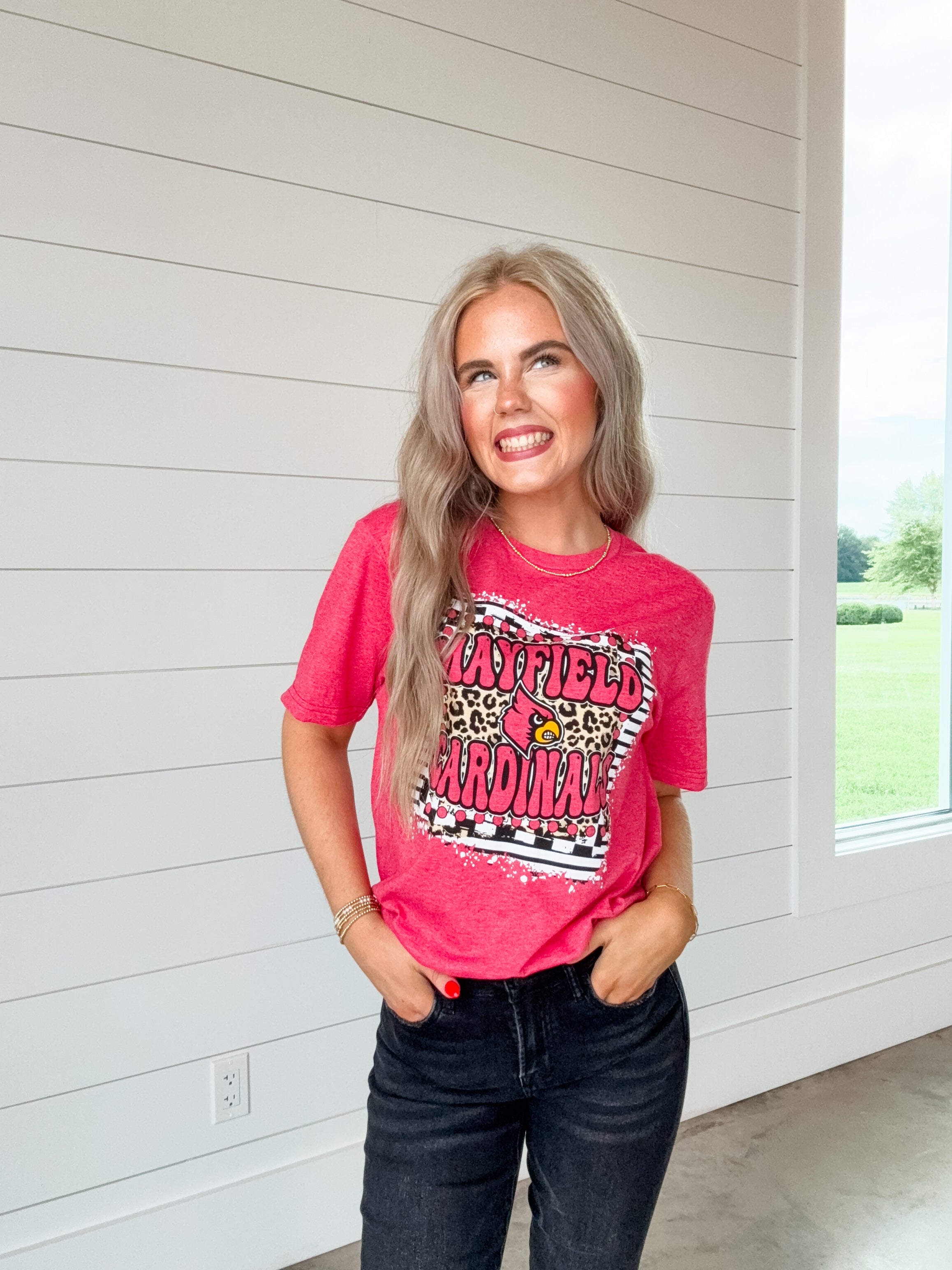 Represent your team in style with the Game Day Cardinals Ready T-Shirt from Mayfield. This red shirt features a unique cheetah and striped pattern, adding a fierce touch to your game day outfit. Show your support for the Cardinals in comfort and fashion.