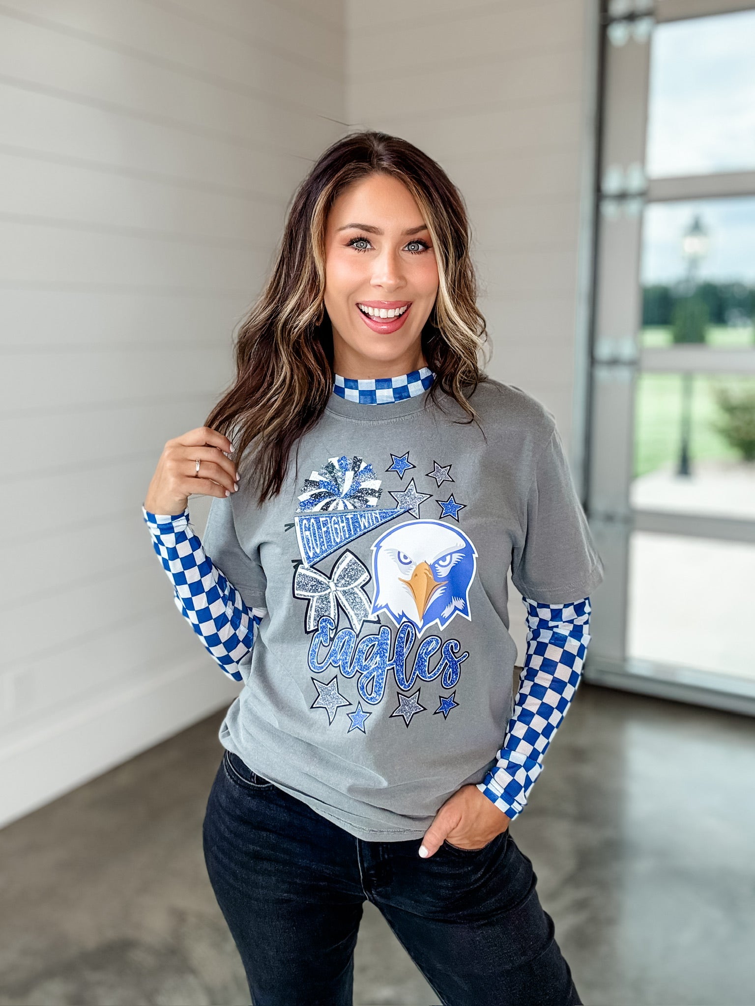 Show off your school spirit with our Comfort Colors Go! Fight! Win! Eagles Spirit Collage Tee. Available in both kids and adult sizes, this tee features a sparkling glitter design to add a touch of glamour to your game day attire. Show your love for the Eagles with this must-have piece.