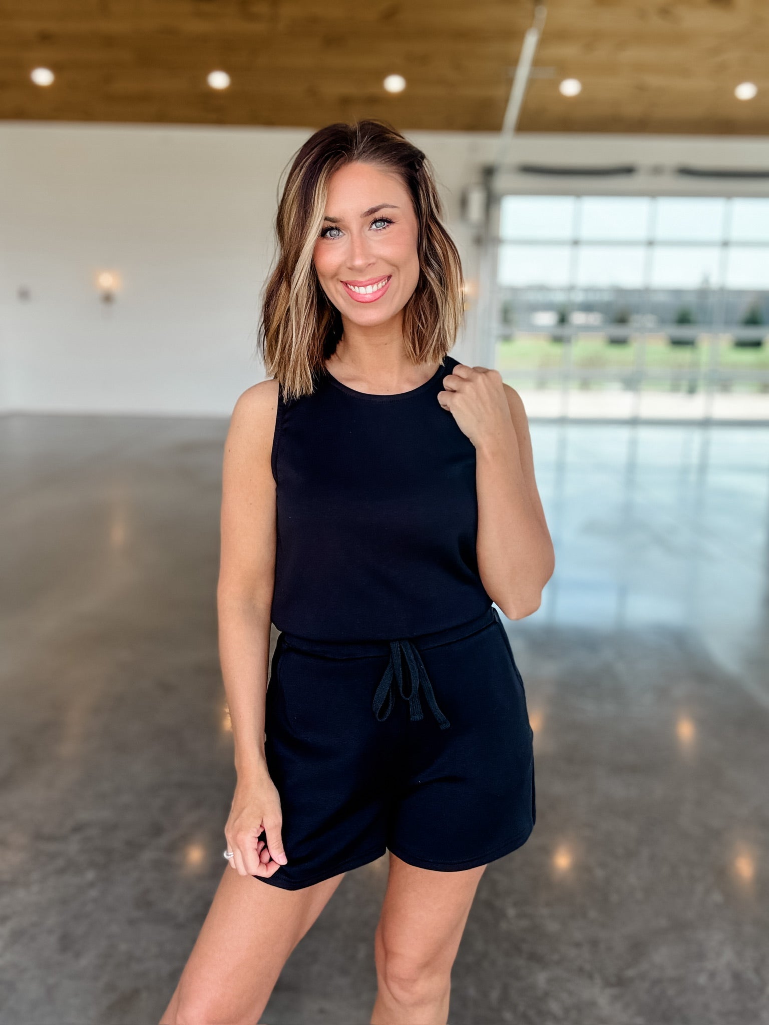 Stay comfortable and stylish on the go with our Black Electric Energy Romper. This sporty-chic one-piece features a black color, a relaxed sleeveless fit, and a drawstring waist that creates a flattering shape. Designed with soft, lightweight fabric and convenient side pockets, it’s perfect for running errands, casual days out, or staying comfy while still looking put together. Pair it with sneakers or sandals for an effortless everyday look.