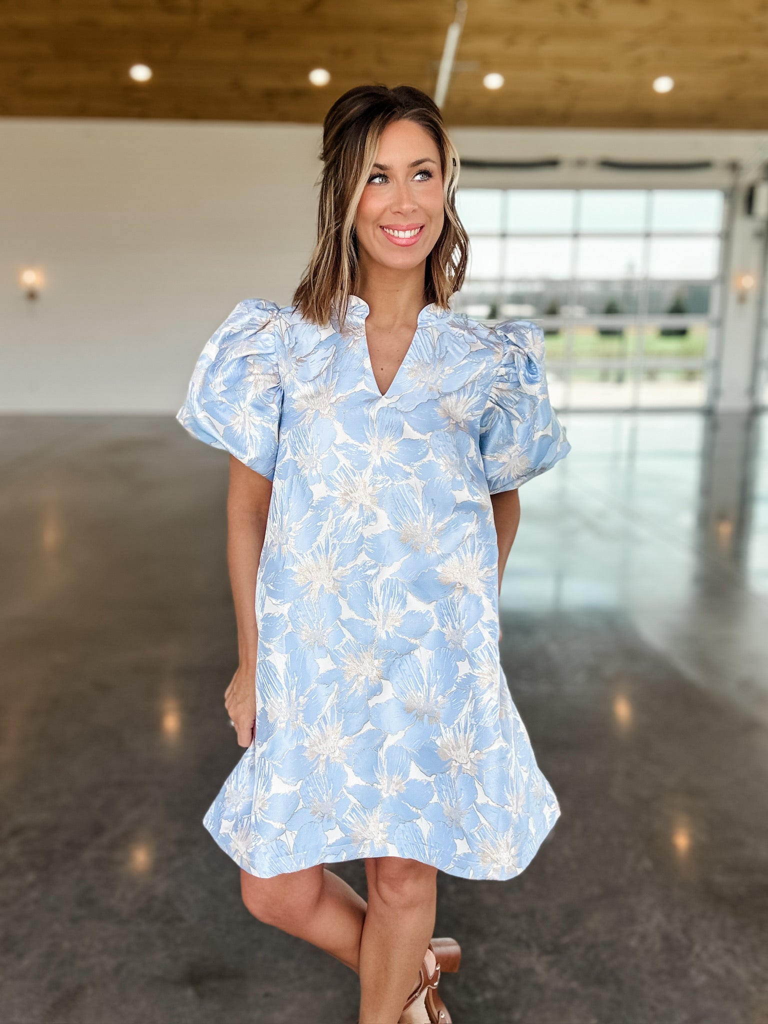 The Carolina Bloom Dress in sky blue features knee-length design with puff sleeves. This combination not only enhances comfort and ease of movement but also provides a flattering silhouette suitable for various occasions. The garment’s color and style contribute to a visually appealing and versatile addition to any wardrobe.
