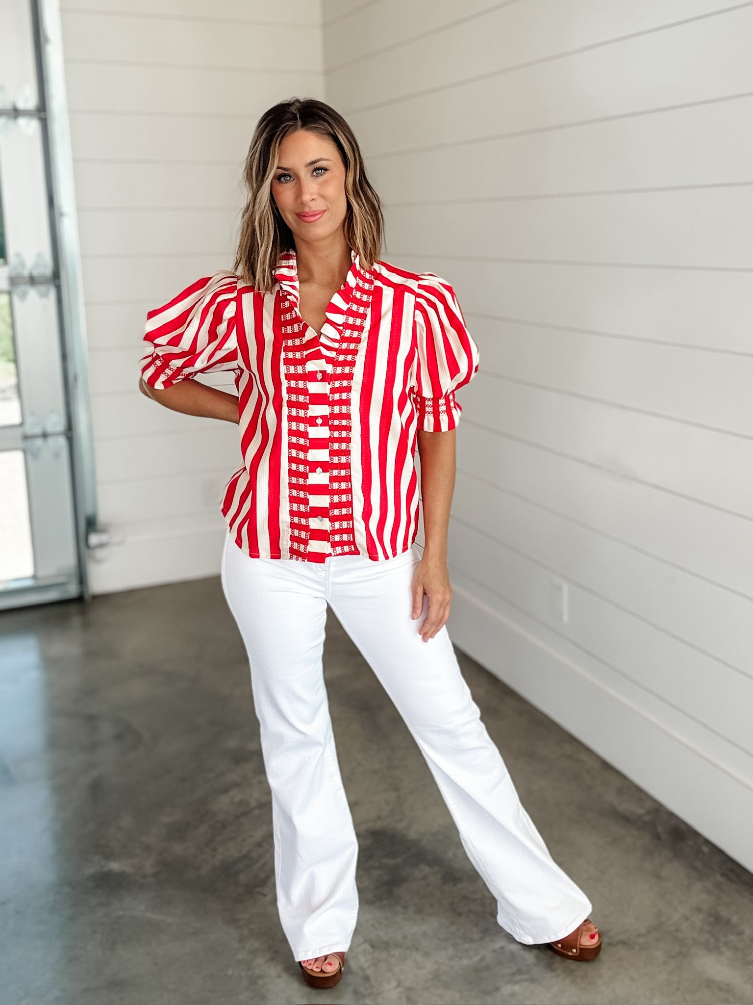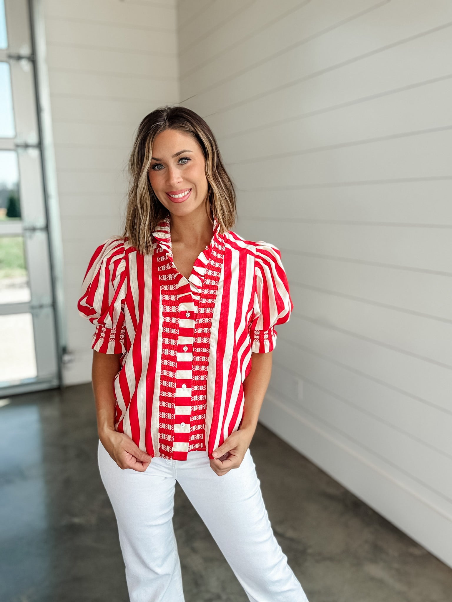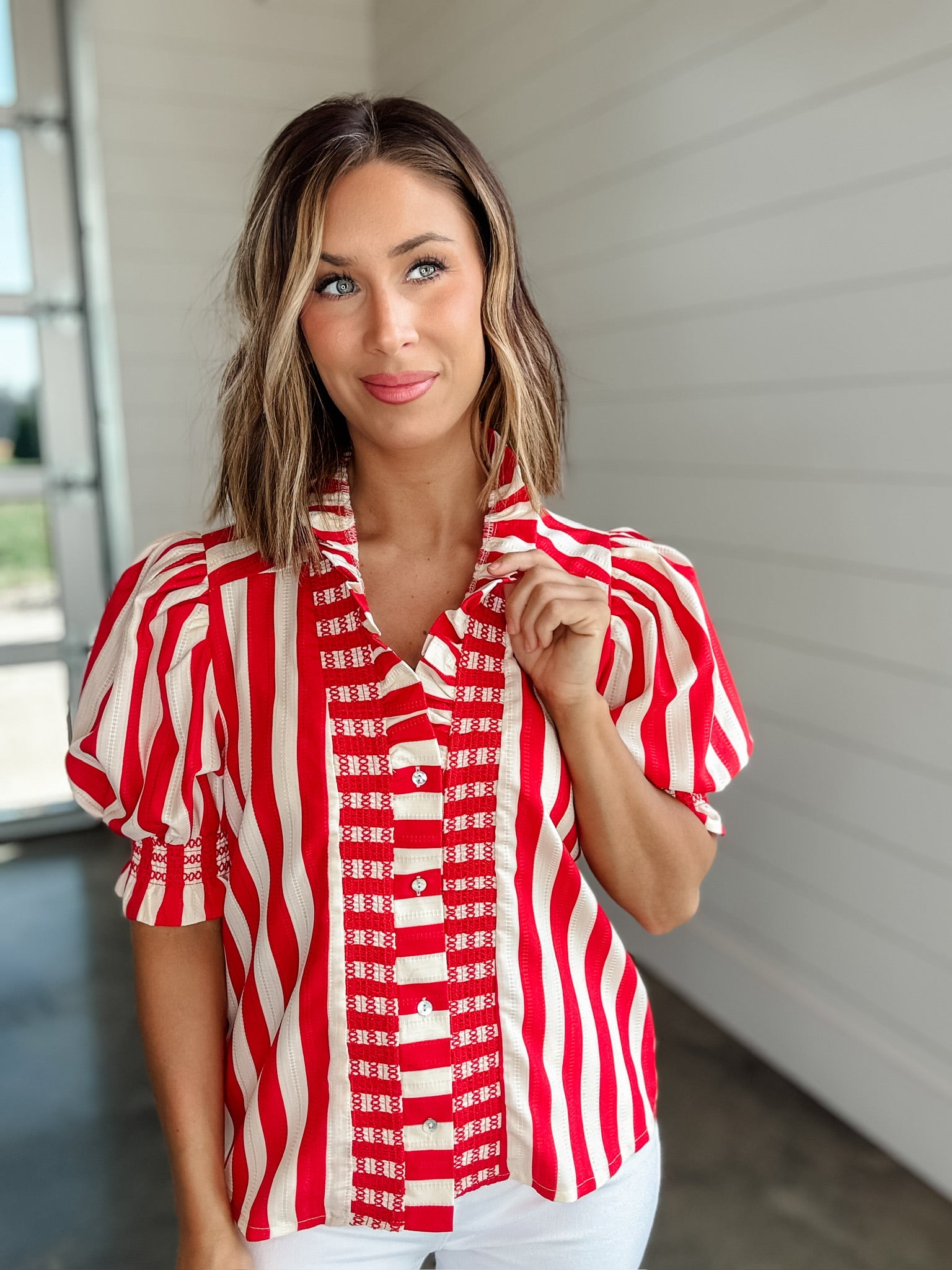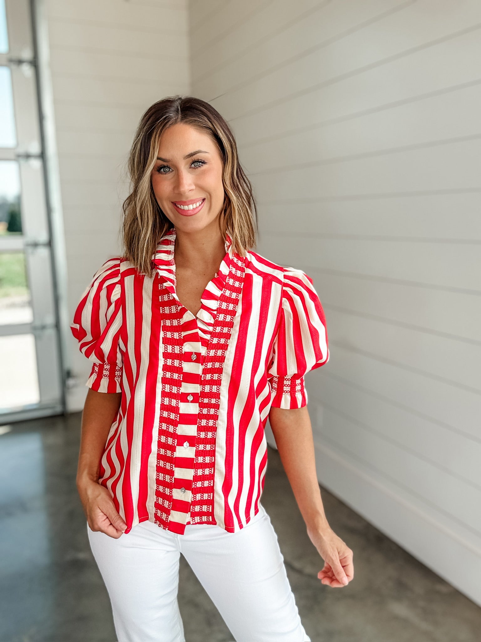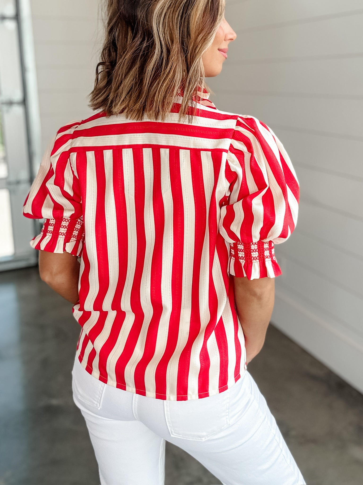 The Cherry On Top Blouse features a classic stripe pattern and cinched sleeves, enhancing both style and comfort. The V-neck design offers a flattering silhouette, making it suitable for various occasions. Its blend of aesthetics and functionality provides versatility while maintaining a professional appearance.