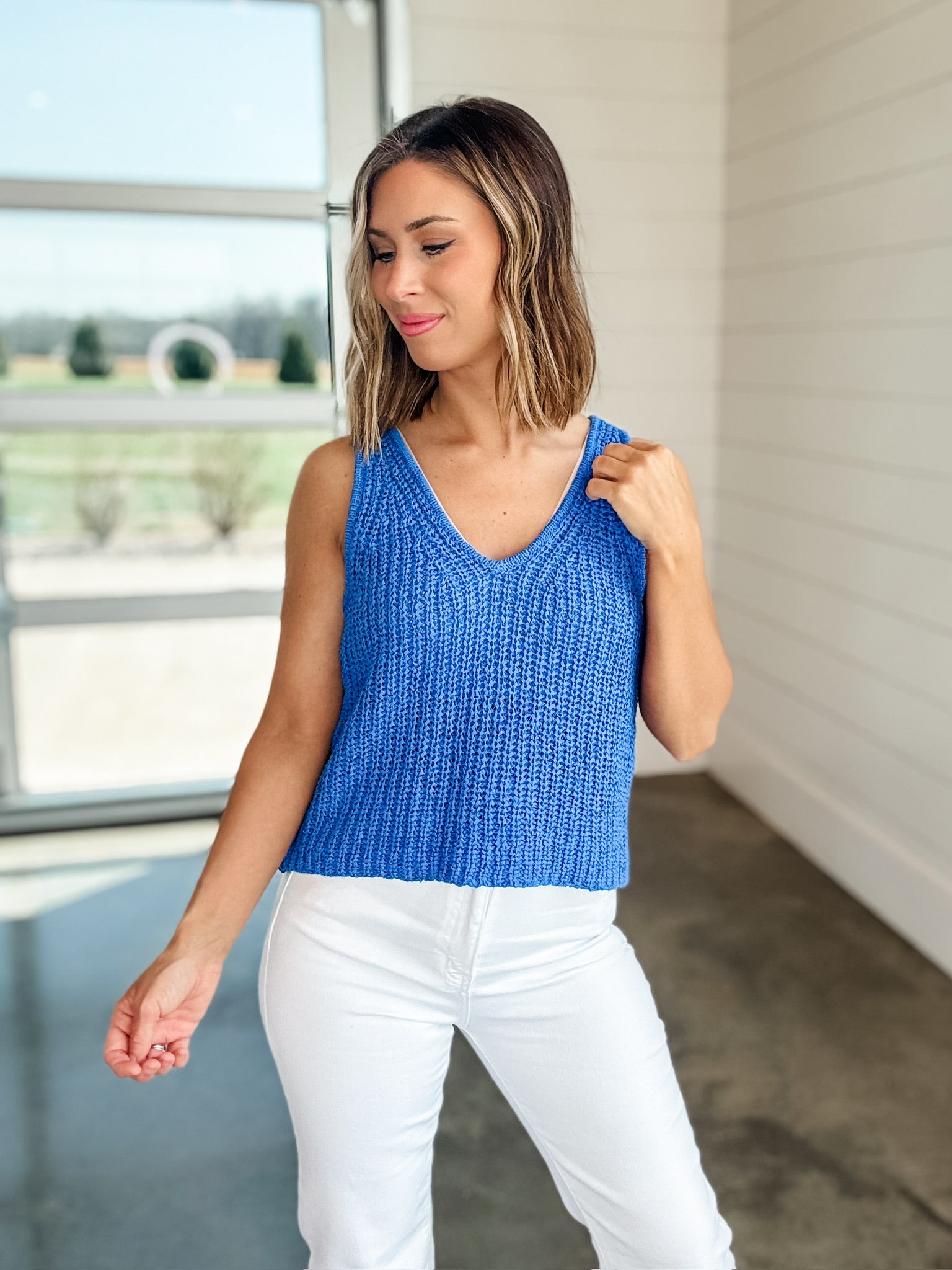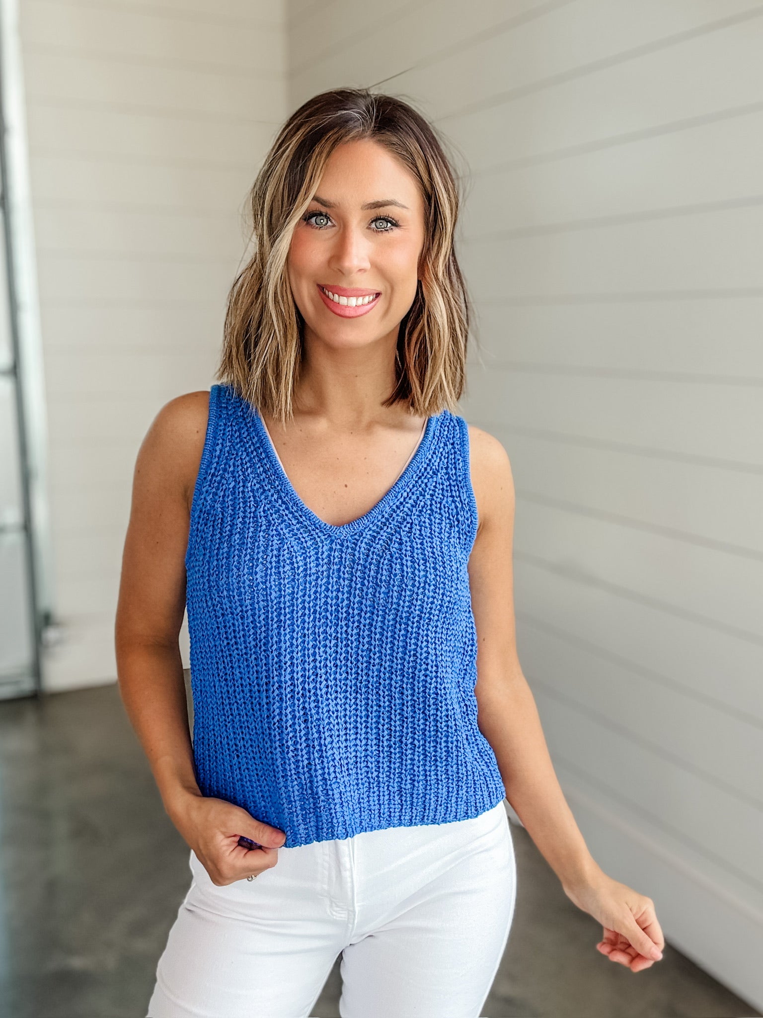 The Ocean Blue Knit Tank Top is crafted from a royal blue knitted fabric, offering both comfort and style. Its breathable material ensures temperature regulation, making it suitable for various climates. The design allows for ease of movement, ideal for both casual wear and active situations.