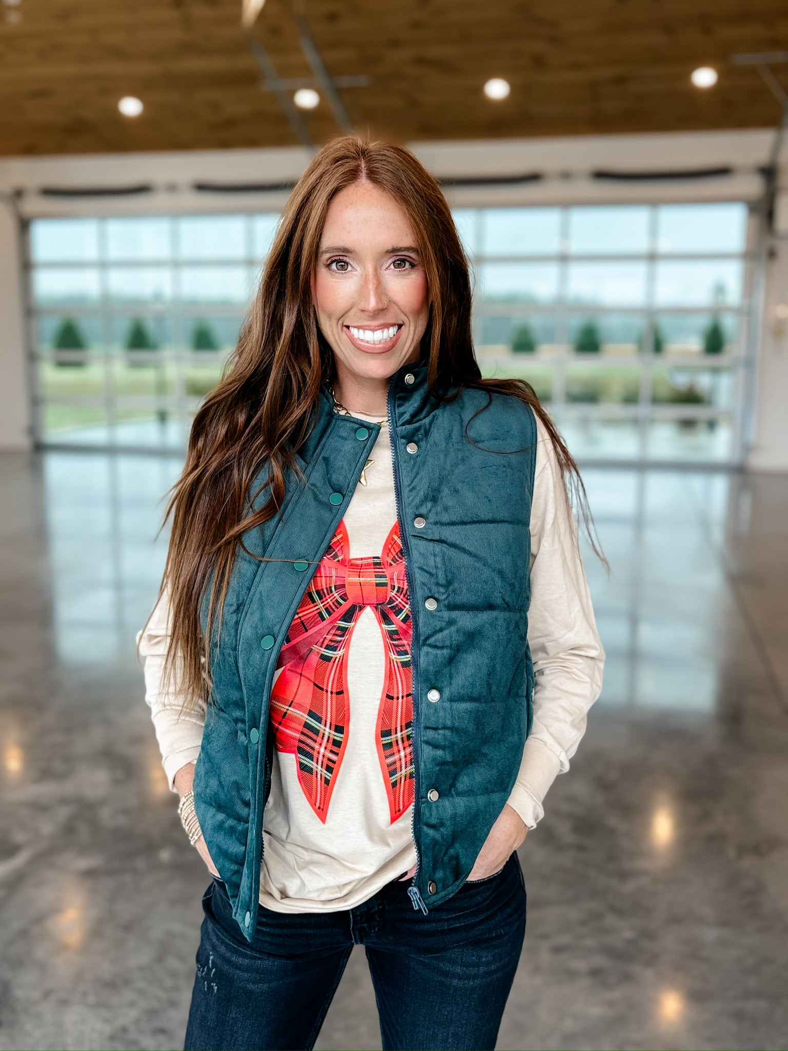 Introducing the Cozy Up Corduroy Puffer Vest, perfect for chilly days. Its dark green color adds a touch of sophistication to any outfit. With a convenient snap and zip front, you can easily layer up and stay warm. Don't let the cold weather stop you from looking stylish and feeling cozy.