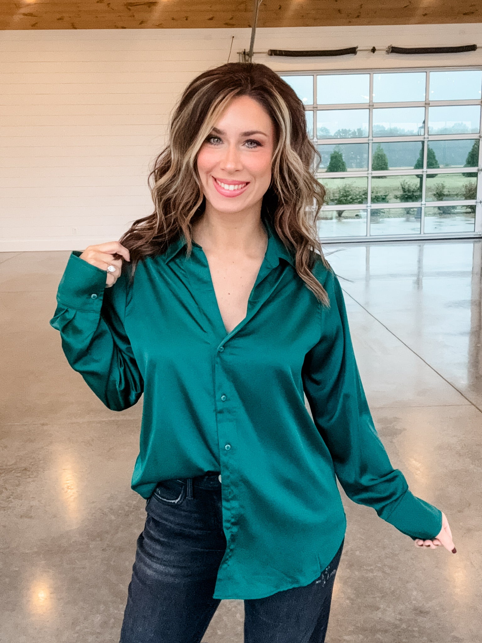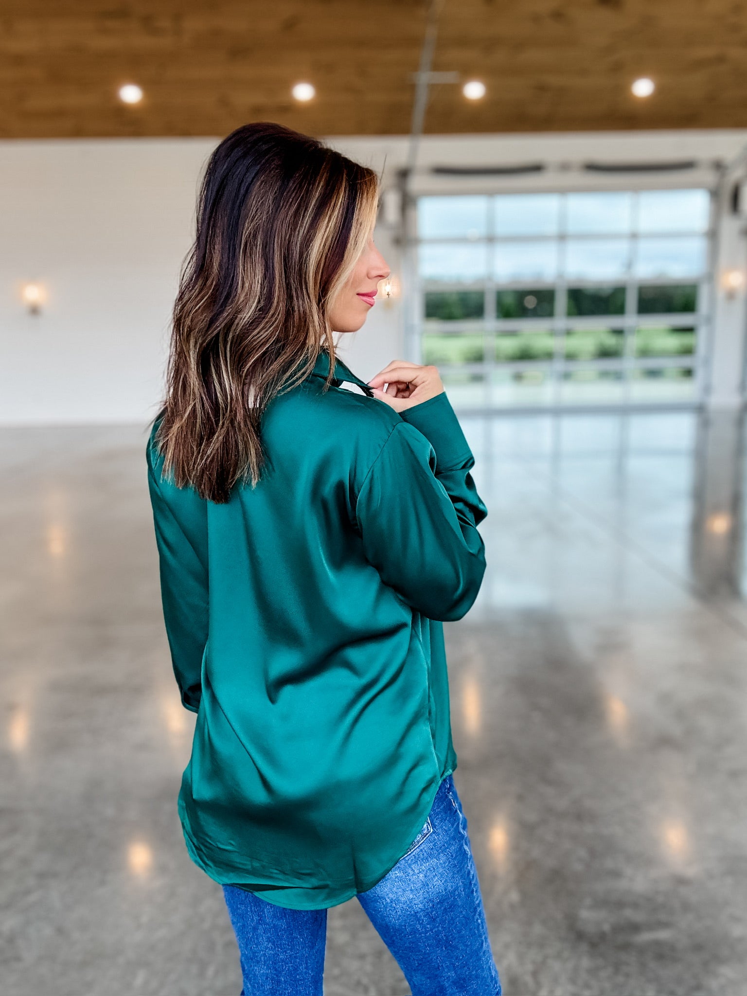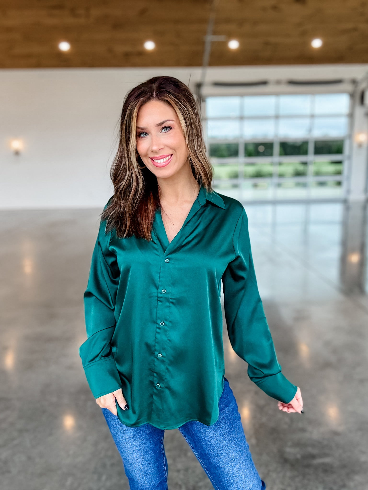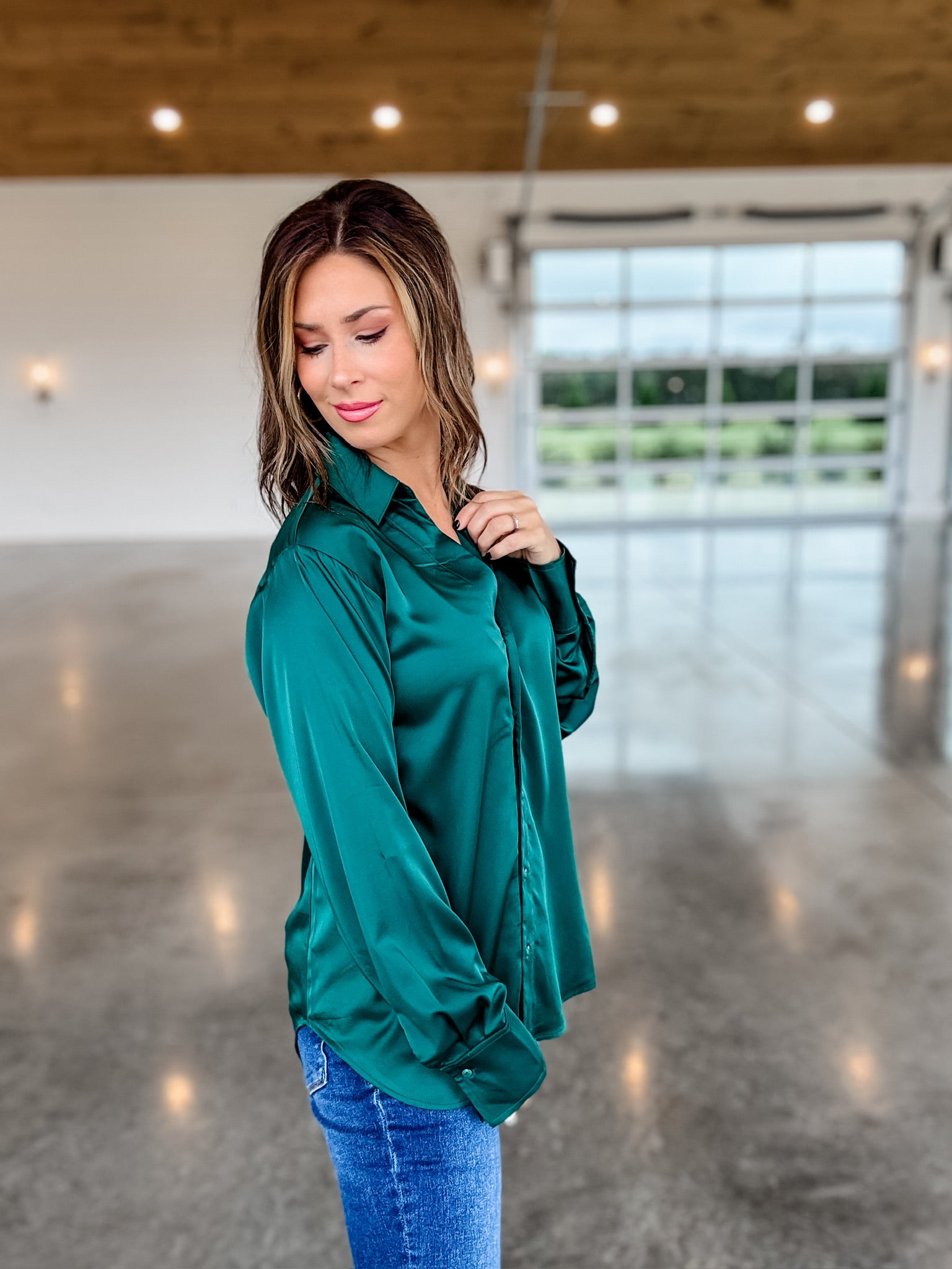Expertly crafted from luxurious satin, this dark green button-up top is the perfect addition to your wardrobe. The long sleeves and woven fabric provide both comfort and style, making it a versatile piece for any occasion. Elevate your look with this elegant and sophisticated top.