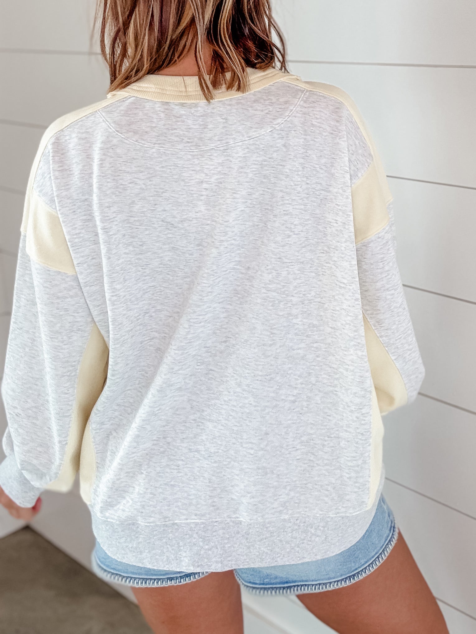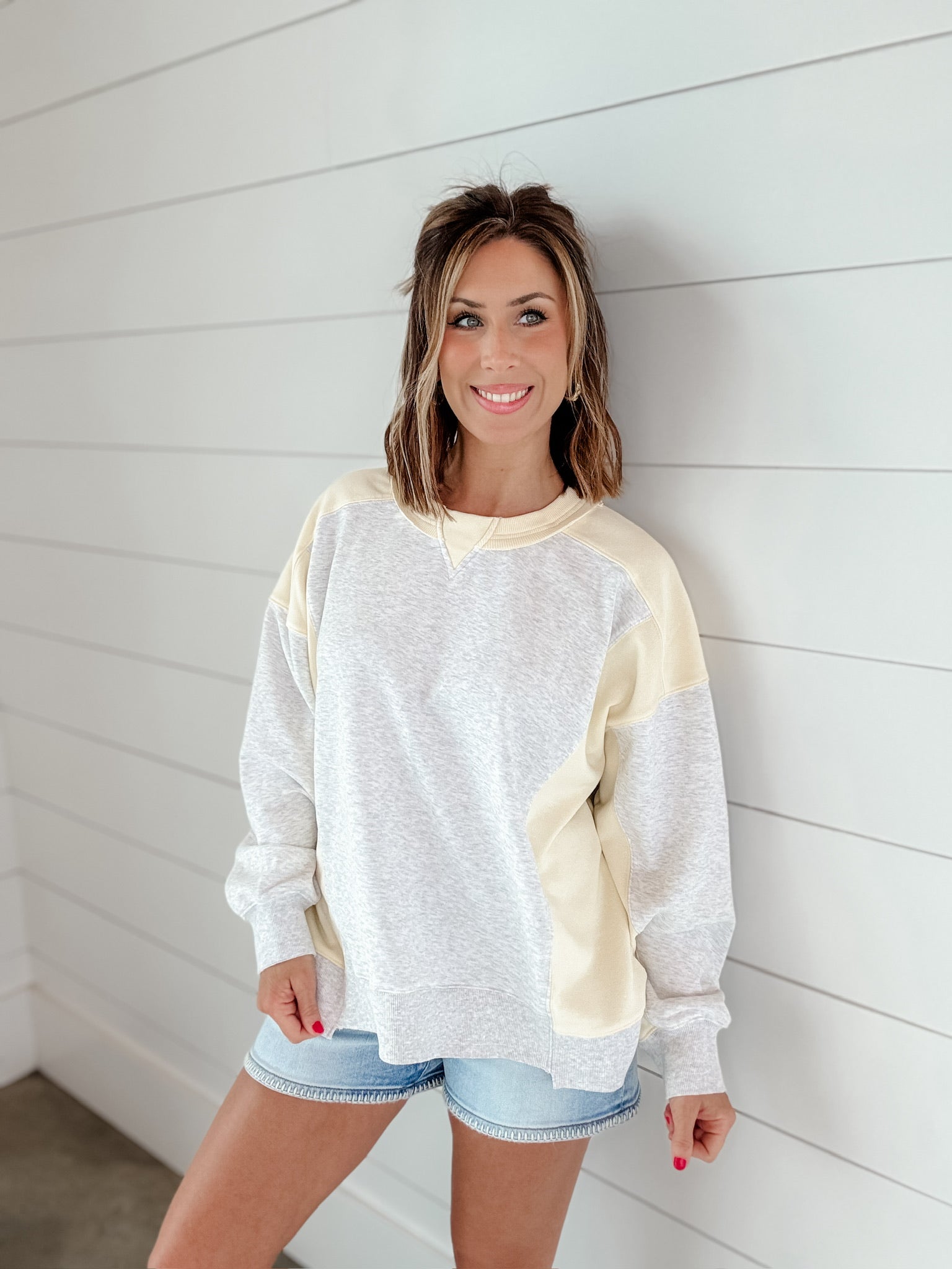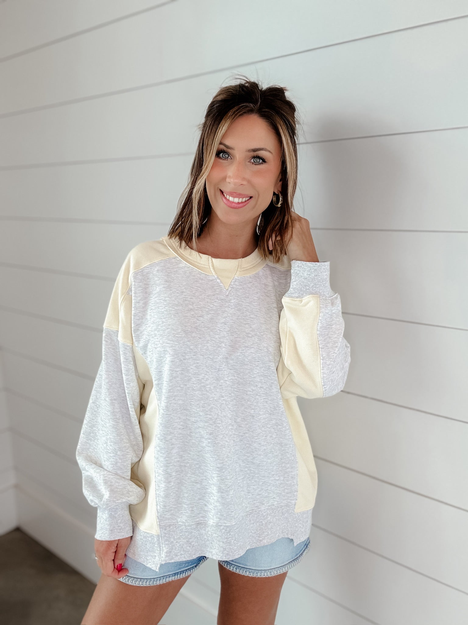 This sweatshirt has a soft, relaxed vibe with a modern color-block design. It features a light heather gray body contrasted with buttery pastel yellow panels along the shoulders, sleeves, and sides. The design includes angled seam details that create a flattering, slightly sporty look. It has a classic crew neckline with ribbed trim and a small V-stitch detail at the collar for that subtle vintage touch. The cuffs and hem are finished with ribbed banding in heather gray, giving it a structured yet cozy fit.