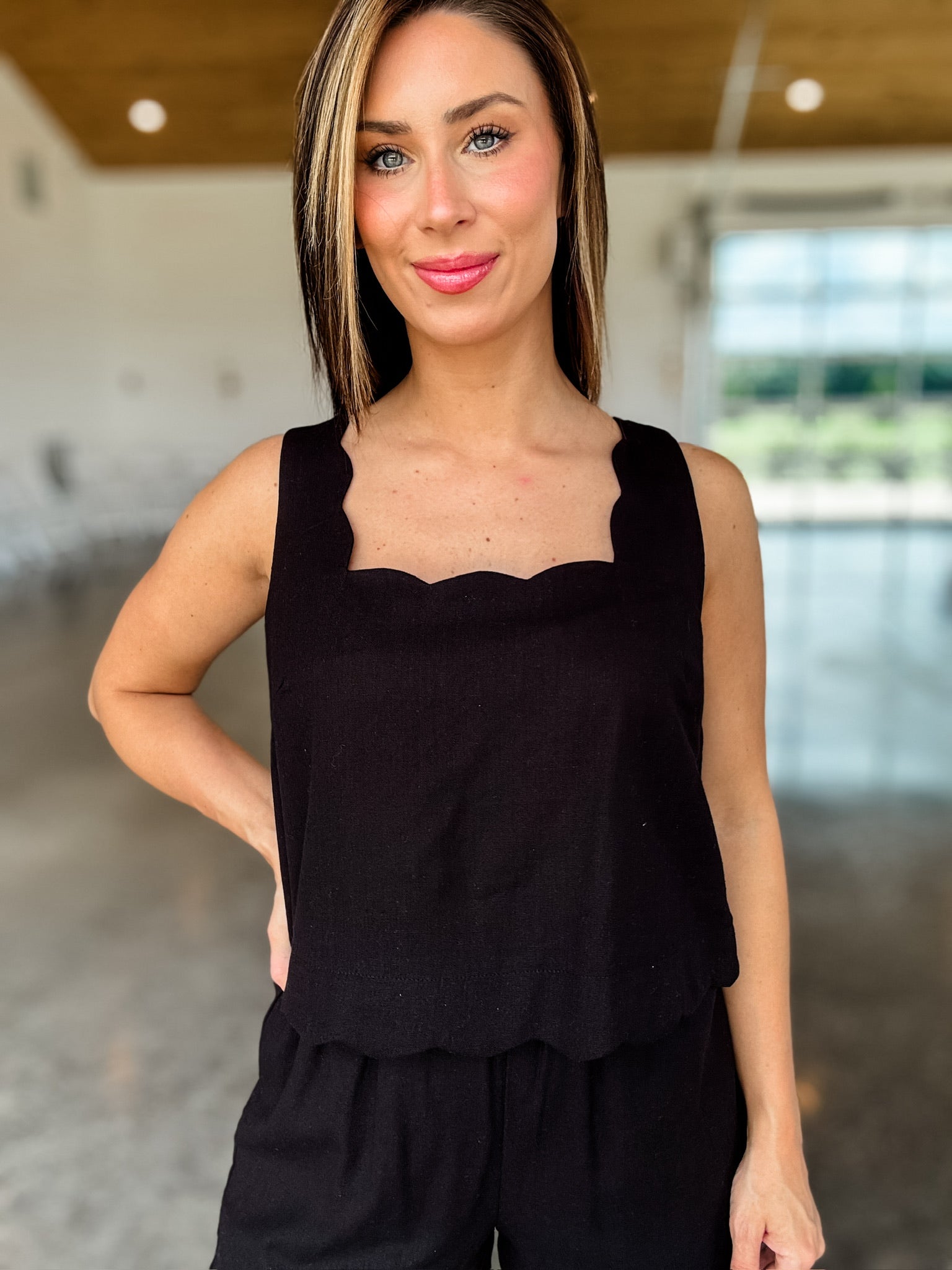 Expertly tailored with scalloped trim, the Out & About Top is a versatile addition to any wardrobe. The sleeveless design and woven fabric provide both comfort and style, making it perfect for any occasion. Bonus: the classic black color goes with just about anything.