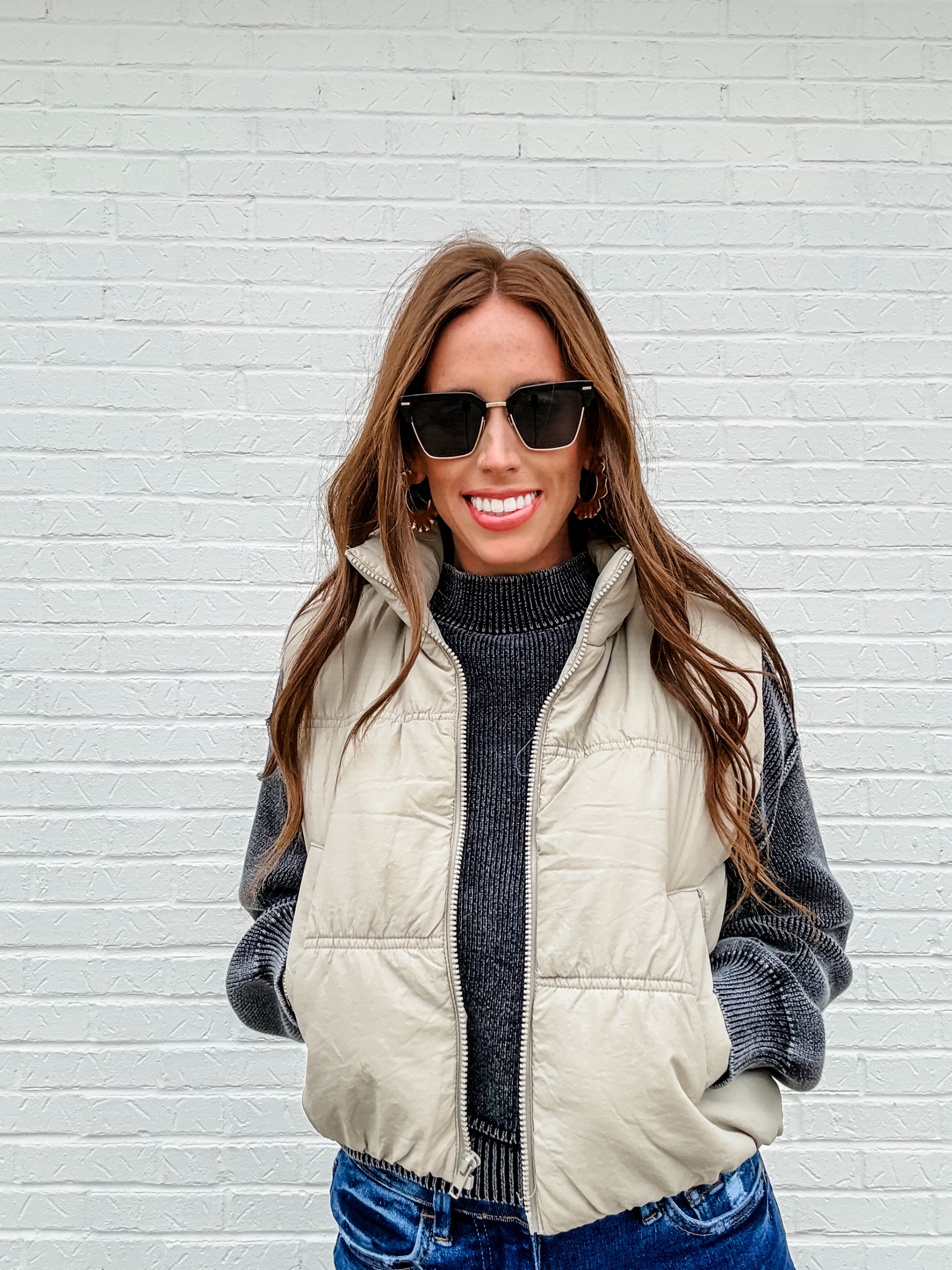 Stay warm in style with our Collared Zip Up Puffer Vest. Designed with a cropped hem and a classic collar, this vest is both stylish and functional. The cement color adds a touch of sophistication to any outfit. Perfect for chilly days, this vest will keep you cozy and fashionable.
