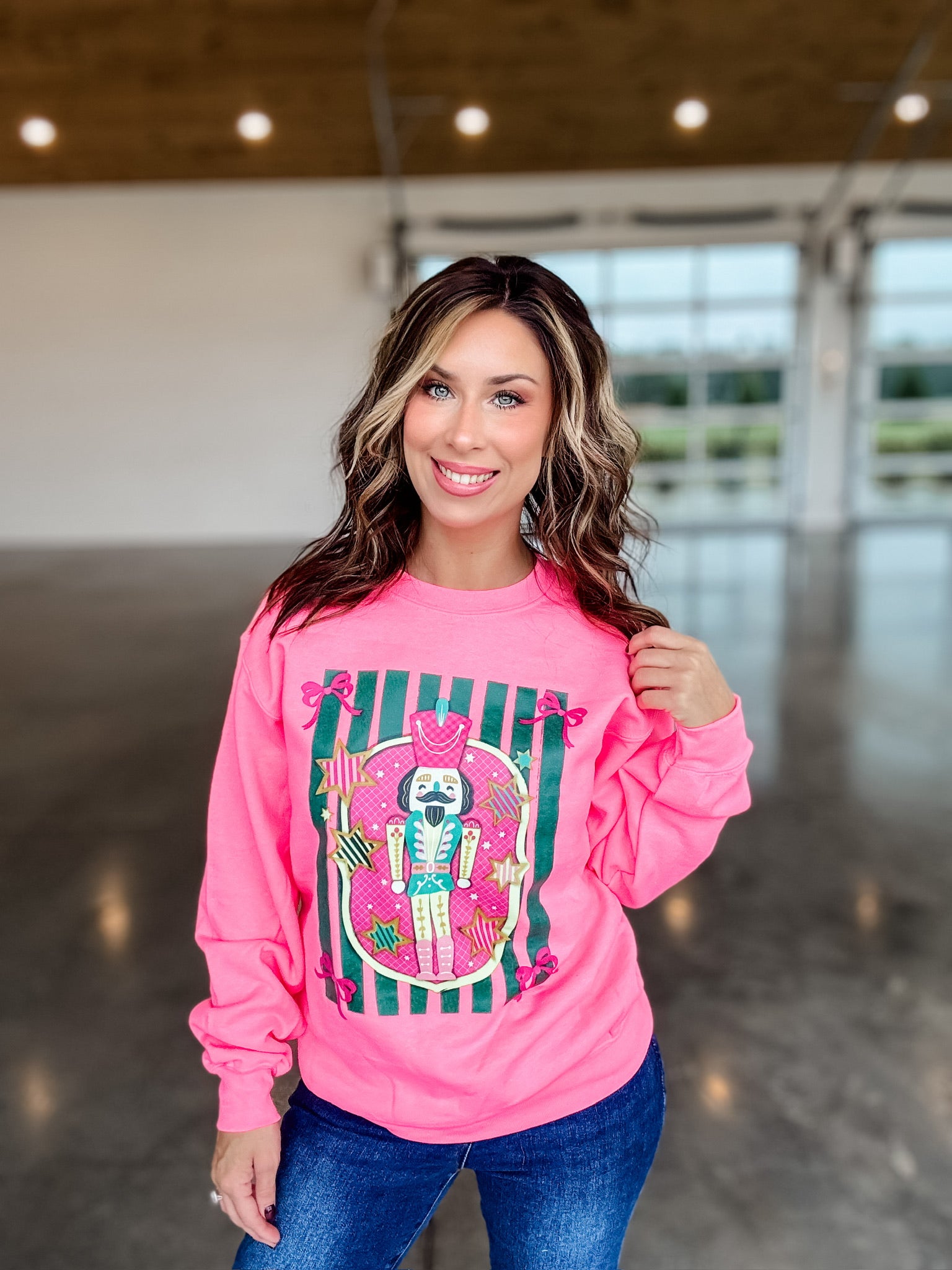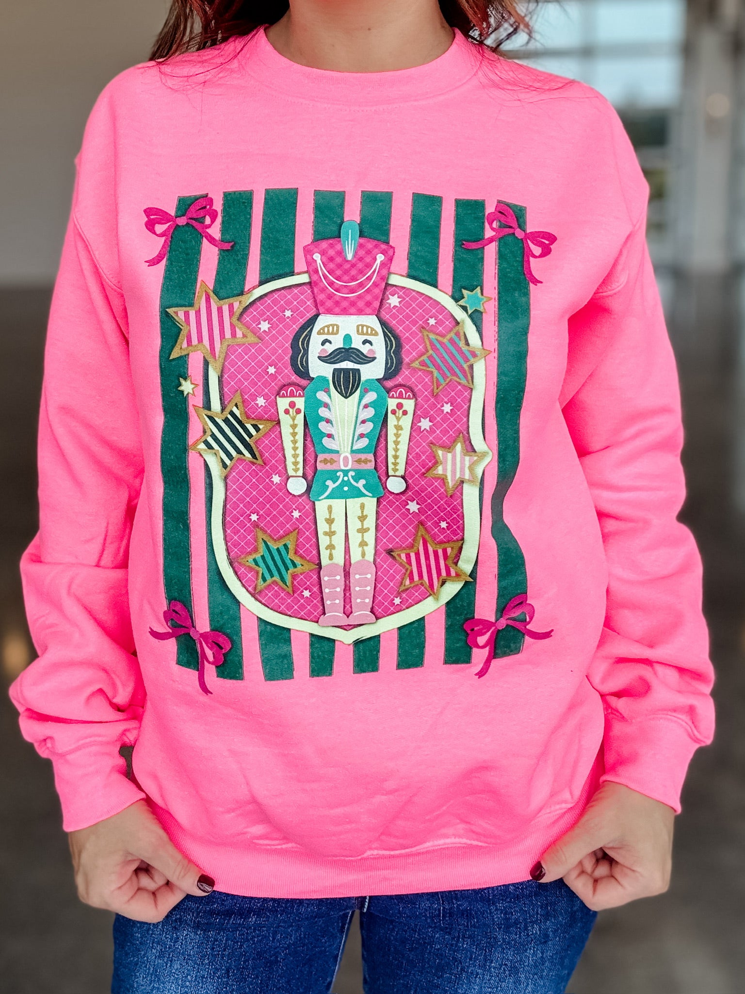 This Whimsey Nutcracker Sweatshirt will make you stand out with its fun nutcracker design. Perfect for the holidays or any day, this sweatshirt adds a touch of whimsy to your wardrobe.