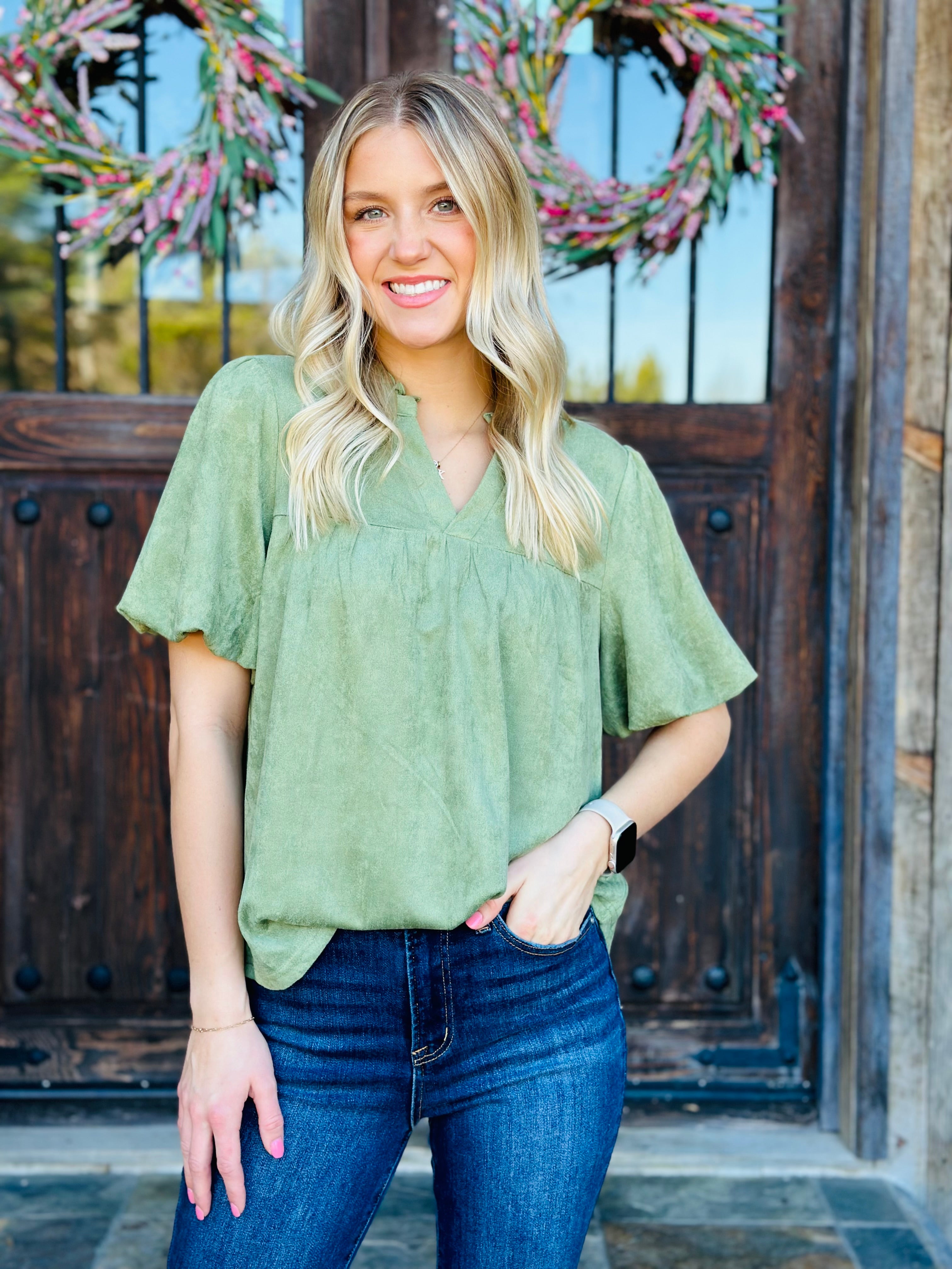This Adore Me Suede Top is an effortless wardrobe staple. Its olive hue and bubble sleeve v-neck design make it a stylish and versatile option. Crafted from quality suede, it's sure to last.