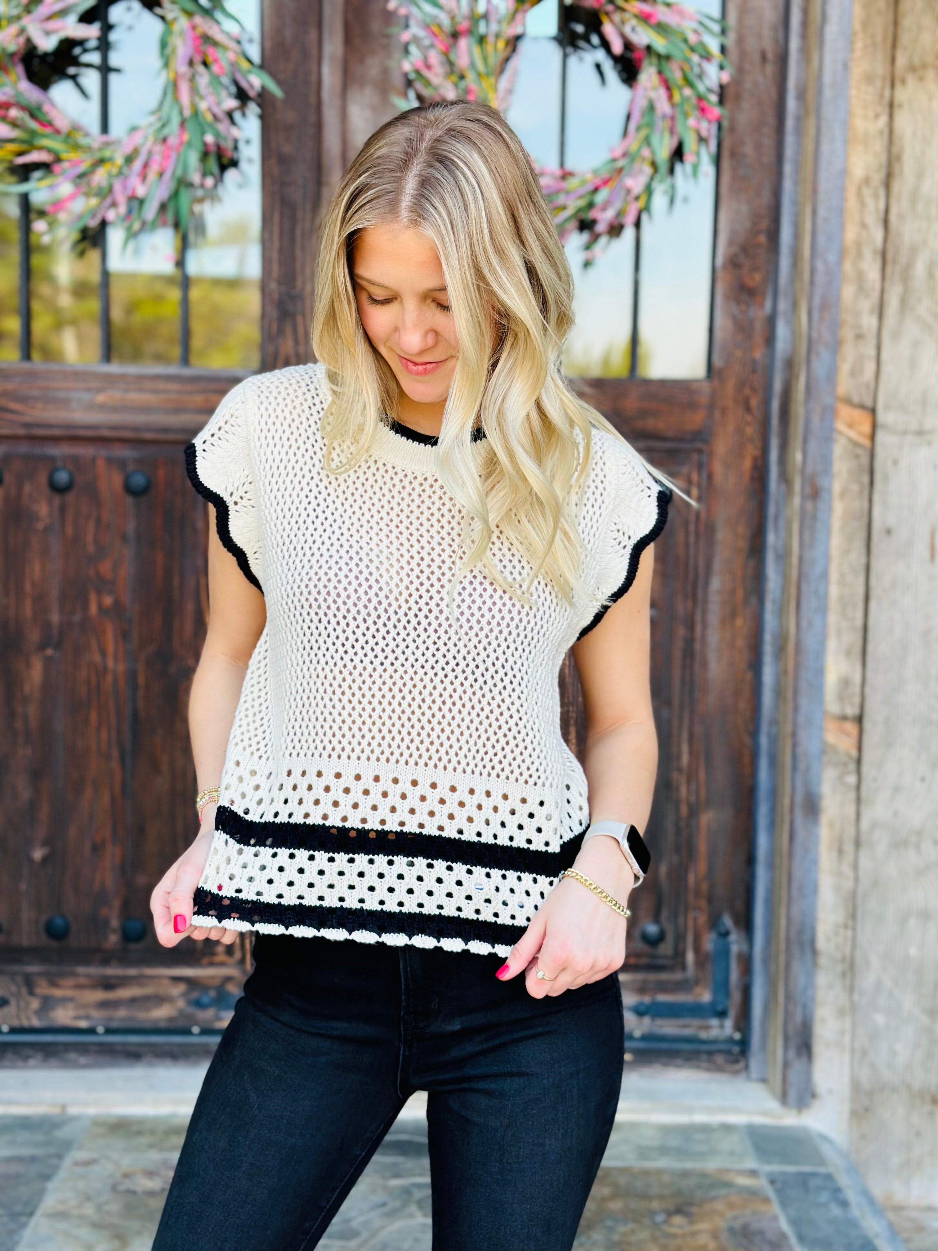 The All In Neutral Top is a versatile and stylish addition to any wardrobe. Made from a soft off-white knit, this top features subtle black detailing for a touch of contrast. Perfect for any occasion, this top effortlessly pairs with any outfit for a chic and classic look. Elevate your style with the All In Neutral Top.