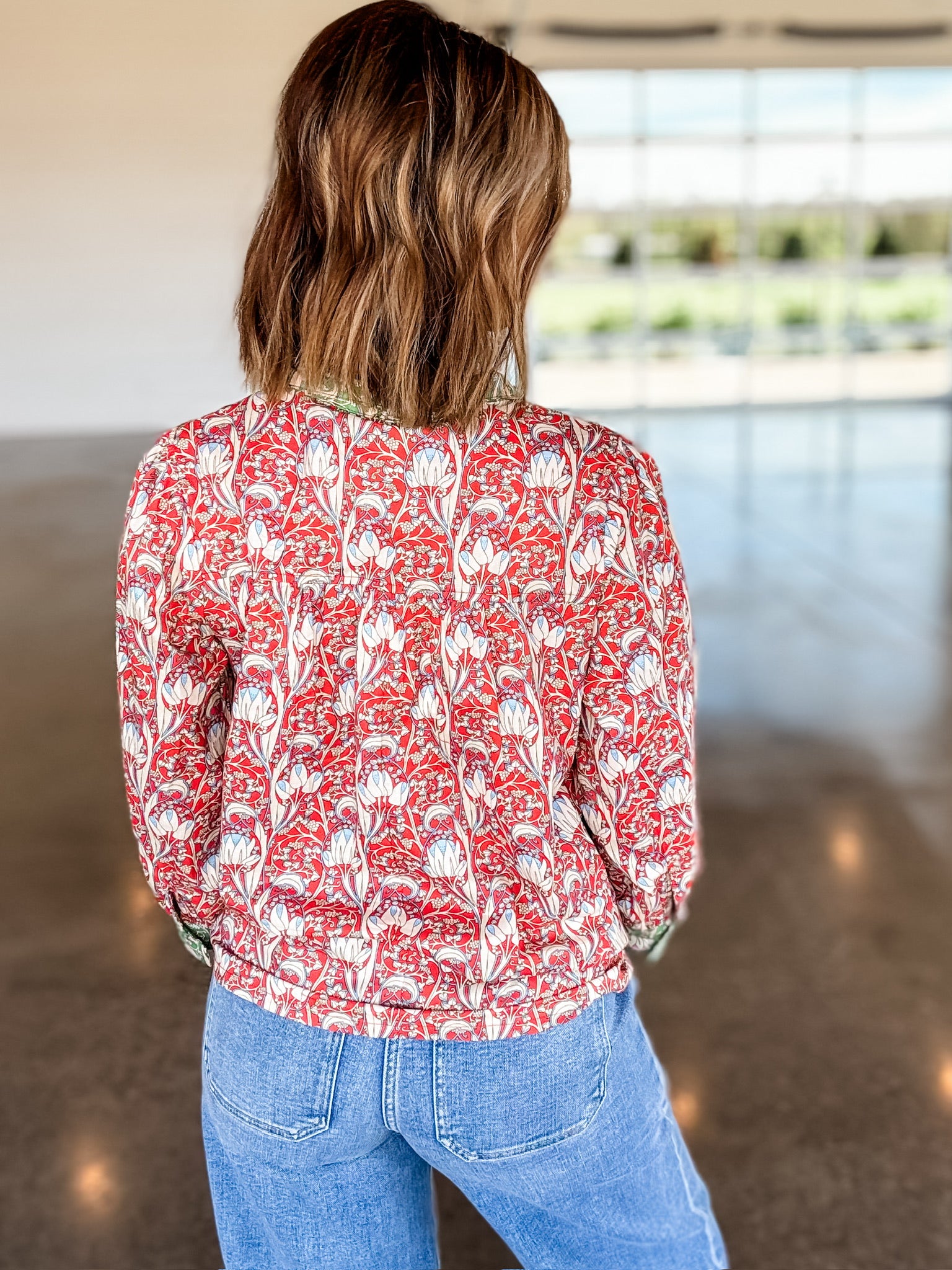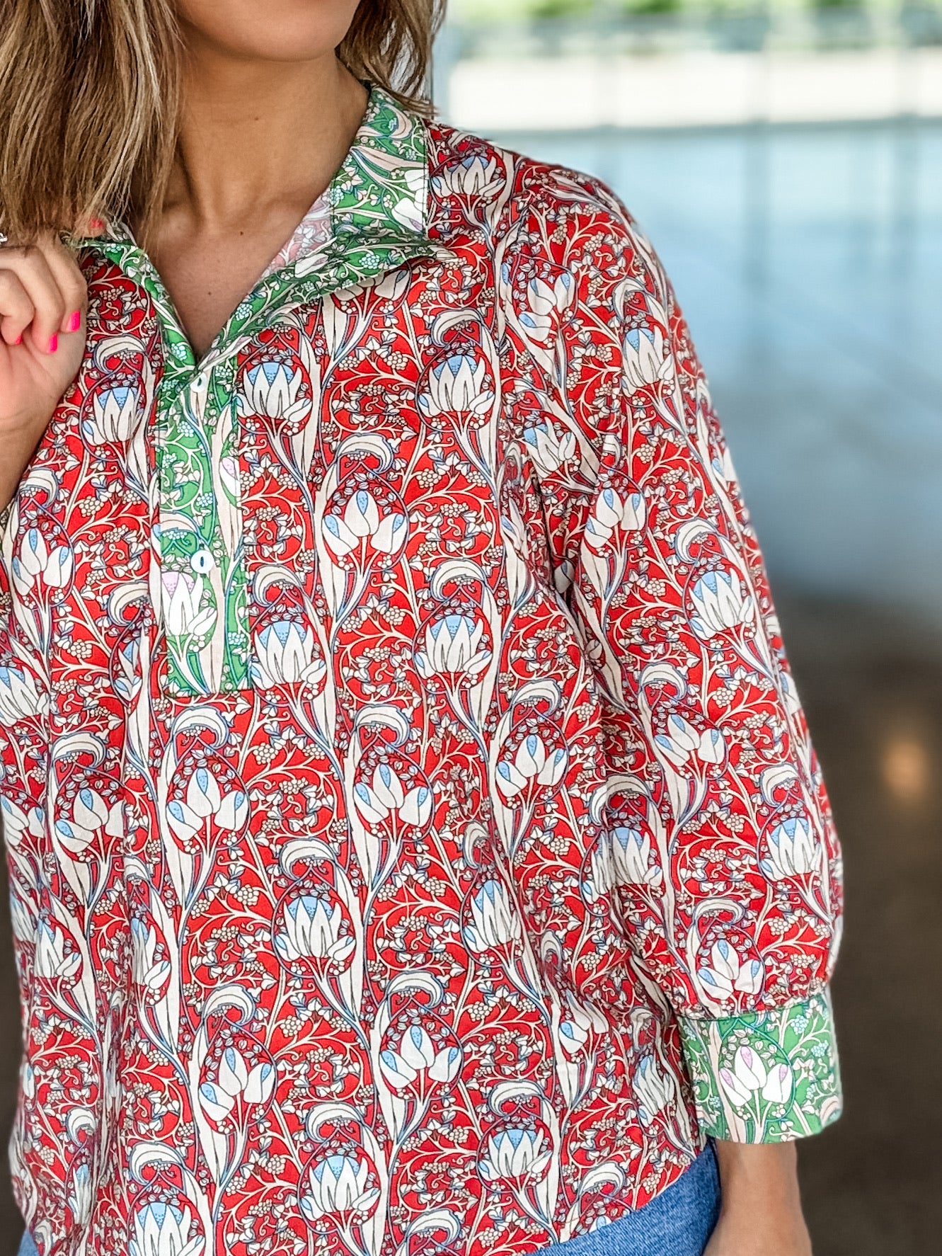 Soft, feminine, and full of vintage charm, this statement blouse features a bold floral print in rich scarlet tones with delicate green accents. Designed with a flattering high neckline and a contrast button placket, it adds just the right touch of detail while keeping things effortlessly polished. The puff sleeves bring a romantic silhouette, making it perfect for dressing up your favorite denim or pairing with a skirt for a more elevated look. Lightweight and eye-catching, this top is your go-to for adding a pop of color and timeless elegance to any outfit. ✨
