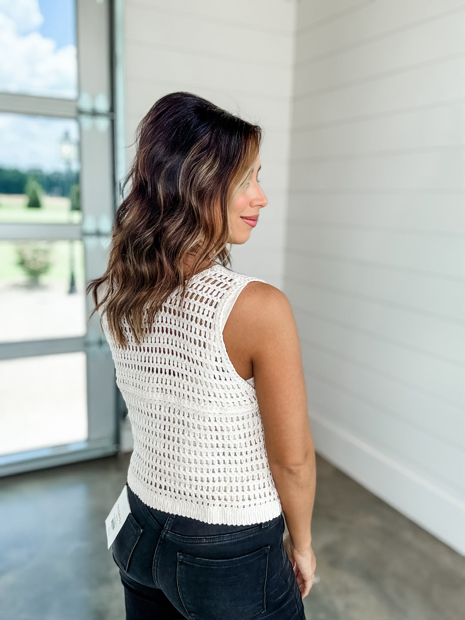 Stay cool and stylish in our Coastal Dreams Top. This crochet knitted tank top is perfect for warm weather, with its button-up front for easy wear. The cream color adds a touch of sophistication to any outfit. Elevate your summer wardrobe with this must-have top.