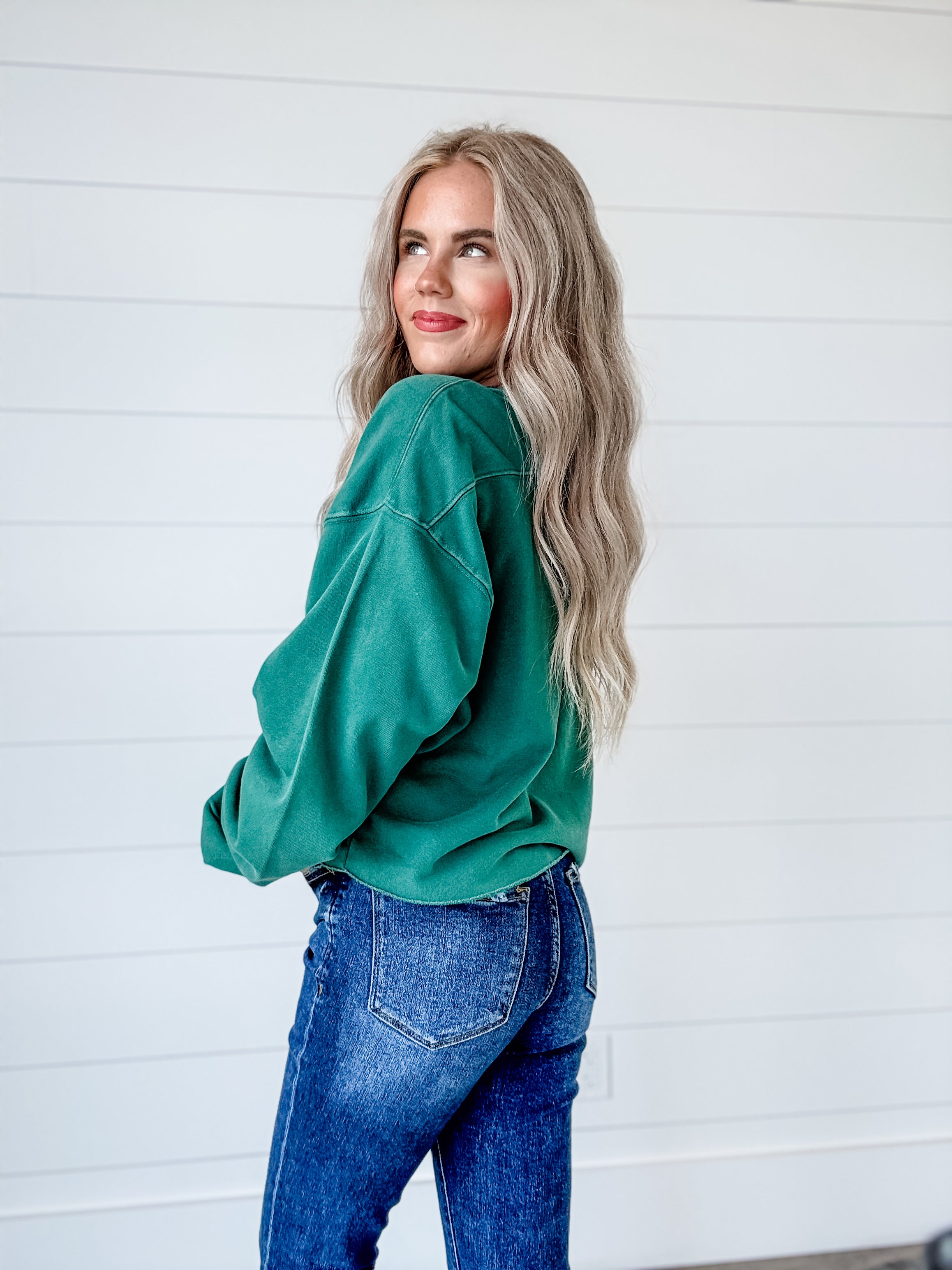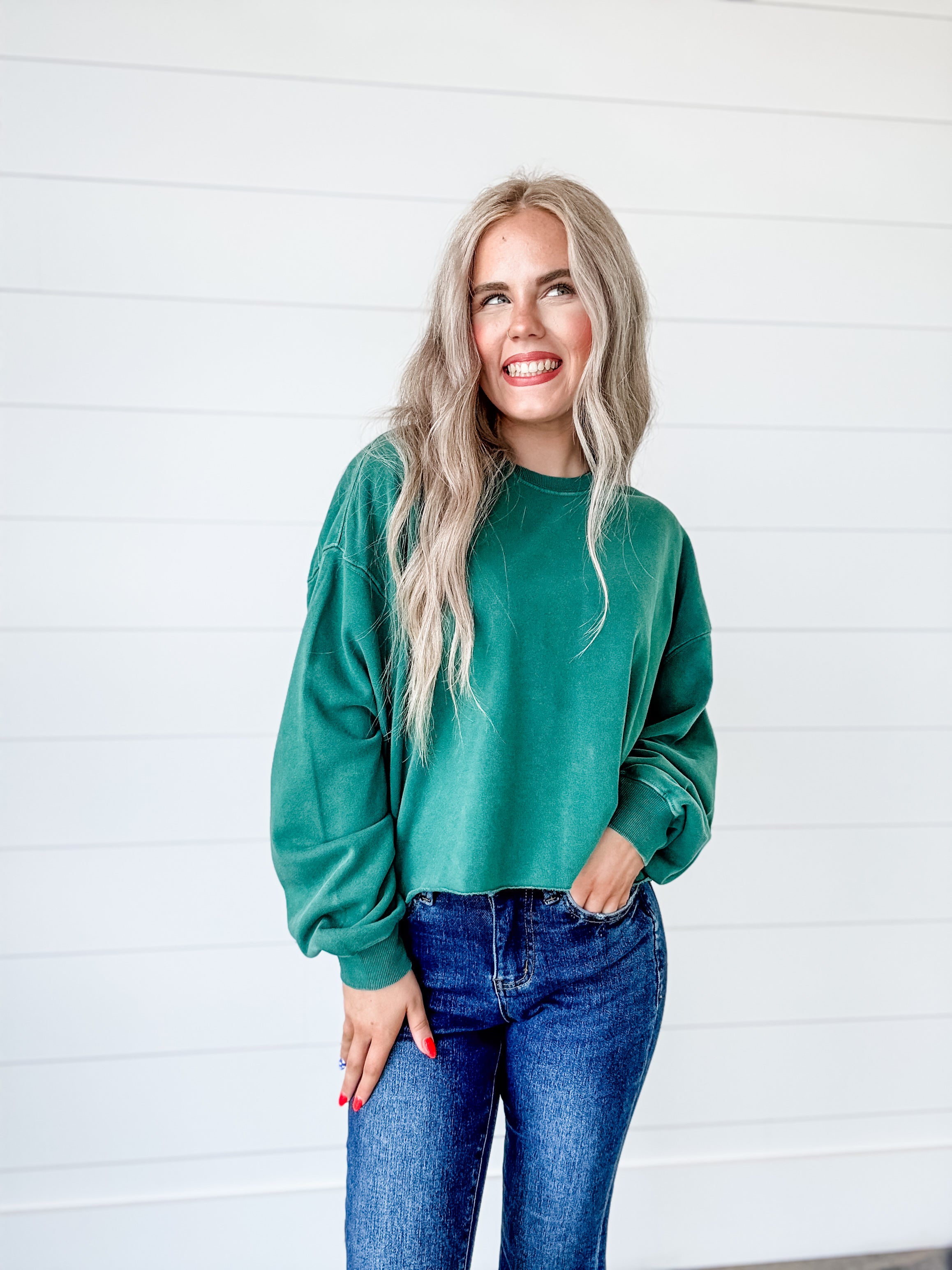 This dark green cropped sweatshirt pullover is perfect for all your casual wear needs. The dark green color adds a touch of sophistication while the cropped style keeps it modern and trendy. Stay comfortable and stylish with this must-have addition to your wardrobe.