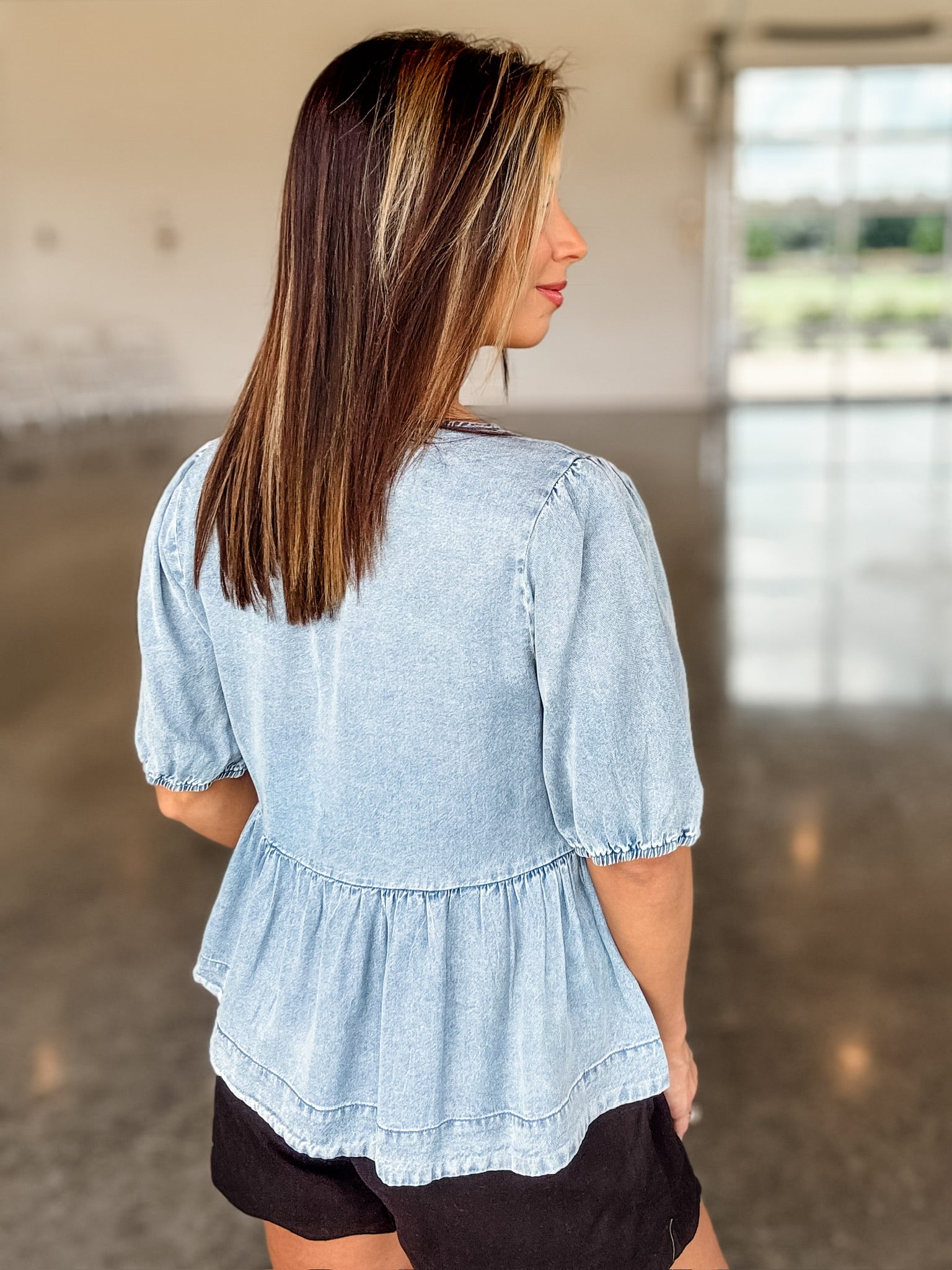 Expertly designed for style and comfort, the Denim Delilah Bow Tie Top features a classic denim material and a charming bow tie detail at the front. Its peplum design adds a feminine touch, making it the perfect addition to any wardrobe.