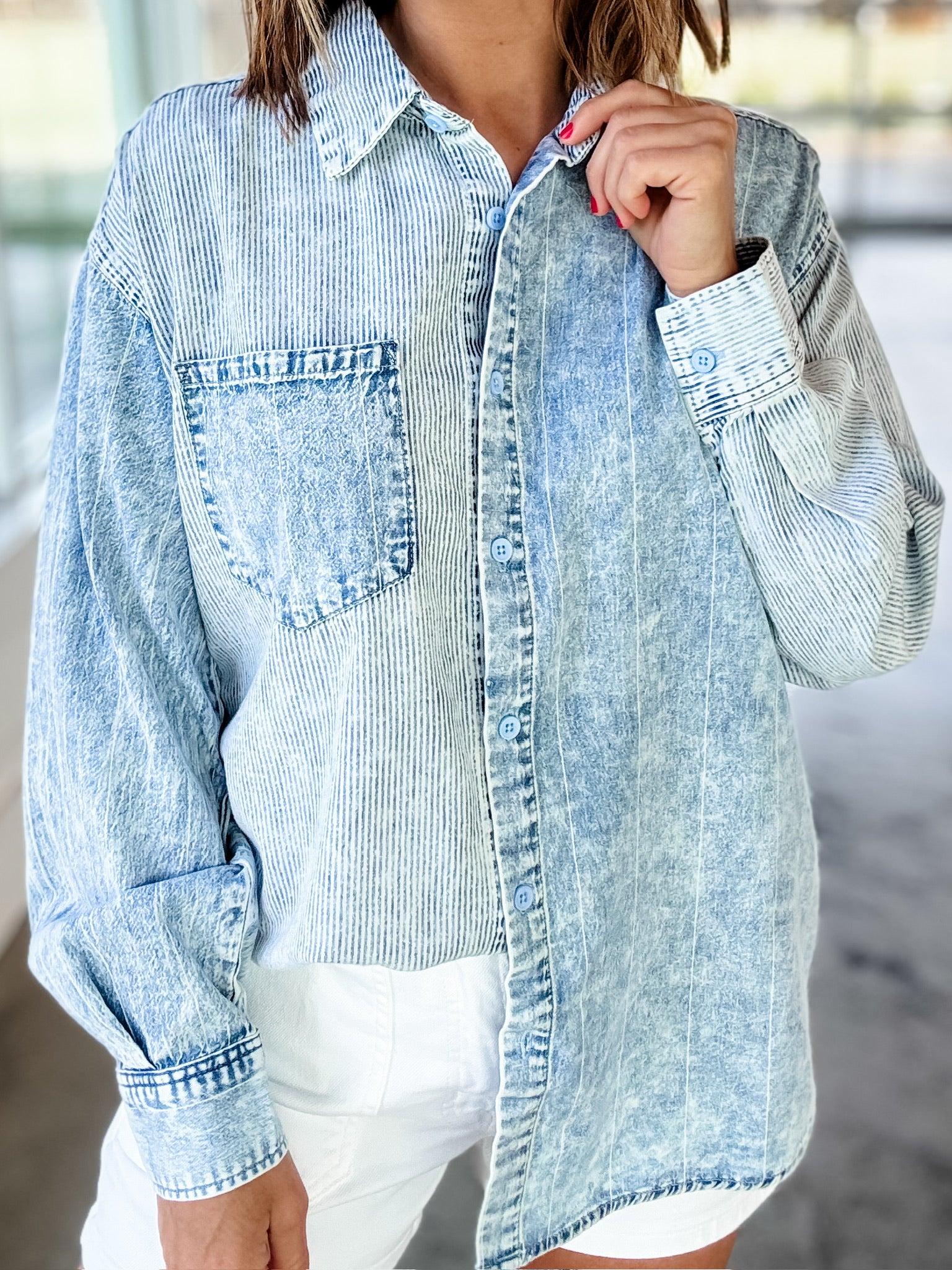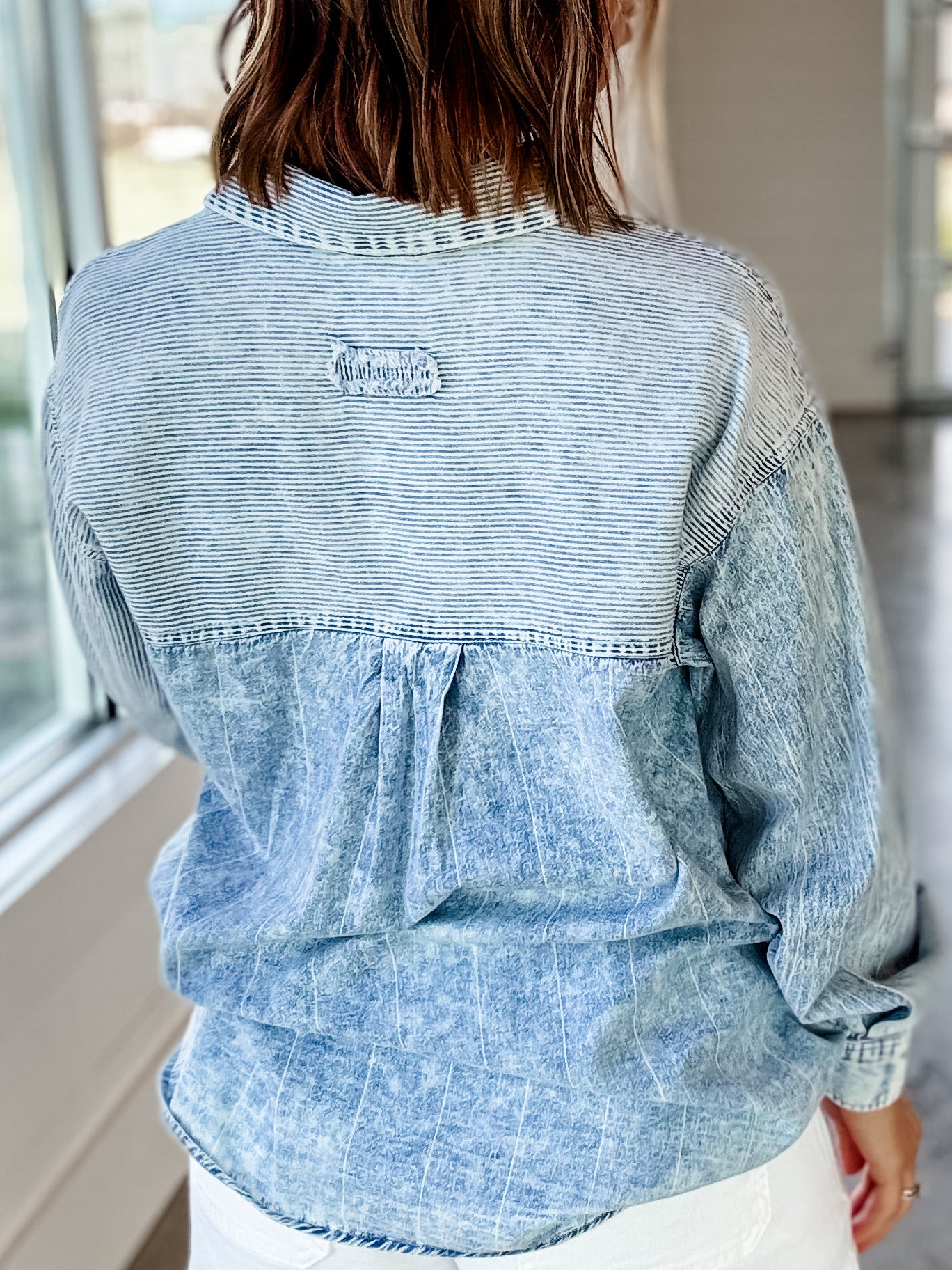 The Denim Duo Top features a classic denim construction complemented by a button-up design, offering versatility in styling. The durable fabric ensures longevity while maintaining comfort. This top is suitable for various occasions, providing a straightforward layering option that complements both casual and semi-formal ensembles.