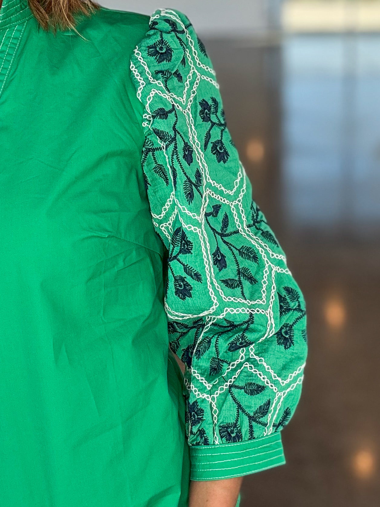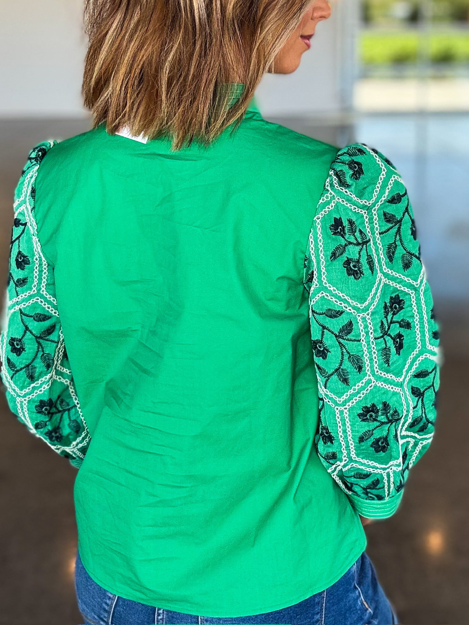 Emerald Embroidered Puff Sleeve Blouse – Chic Statement Top for Women