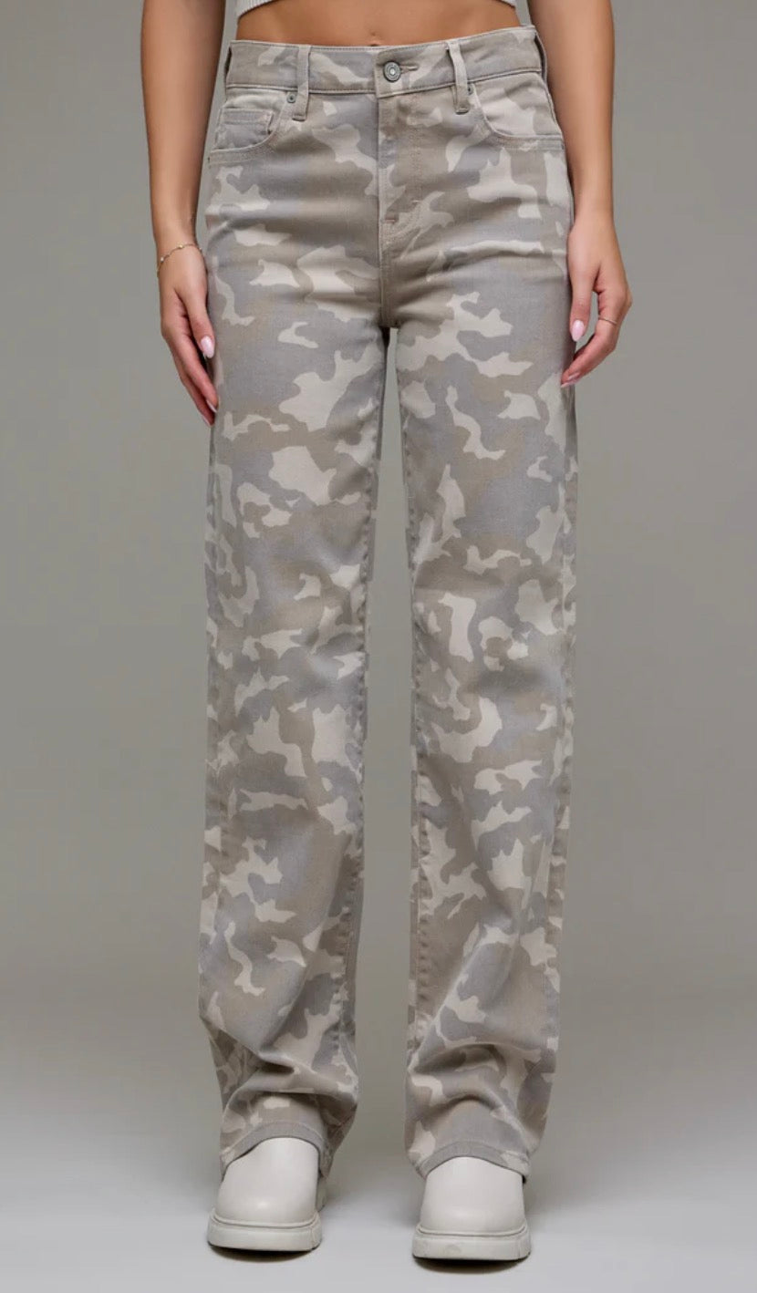 The Hidden Ella Tan Camo Straight Jean features a mid-rise design and a straight leg cut, providing comfort and a flattering fit. The camouflage pattern enhances versatility, allowing for seamless integration into various outfits. This jean is an essential addition for those seeking functional yet stylish apparel.