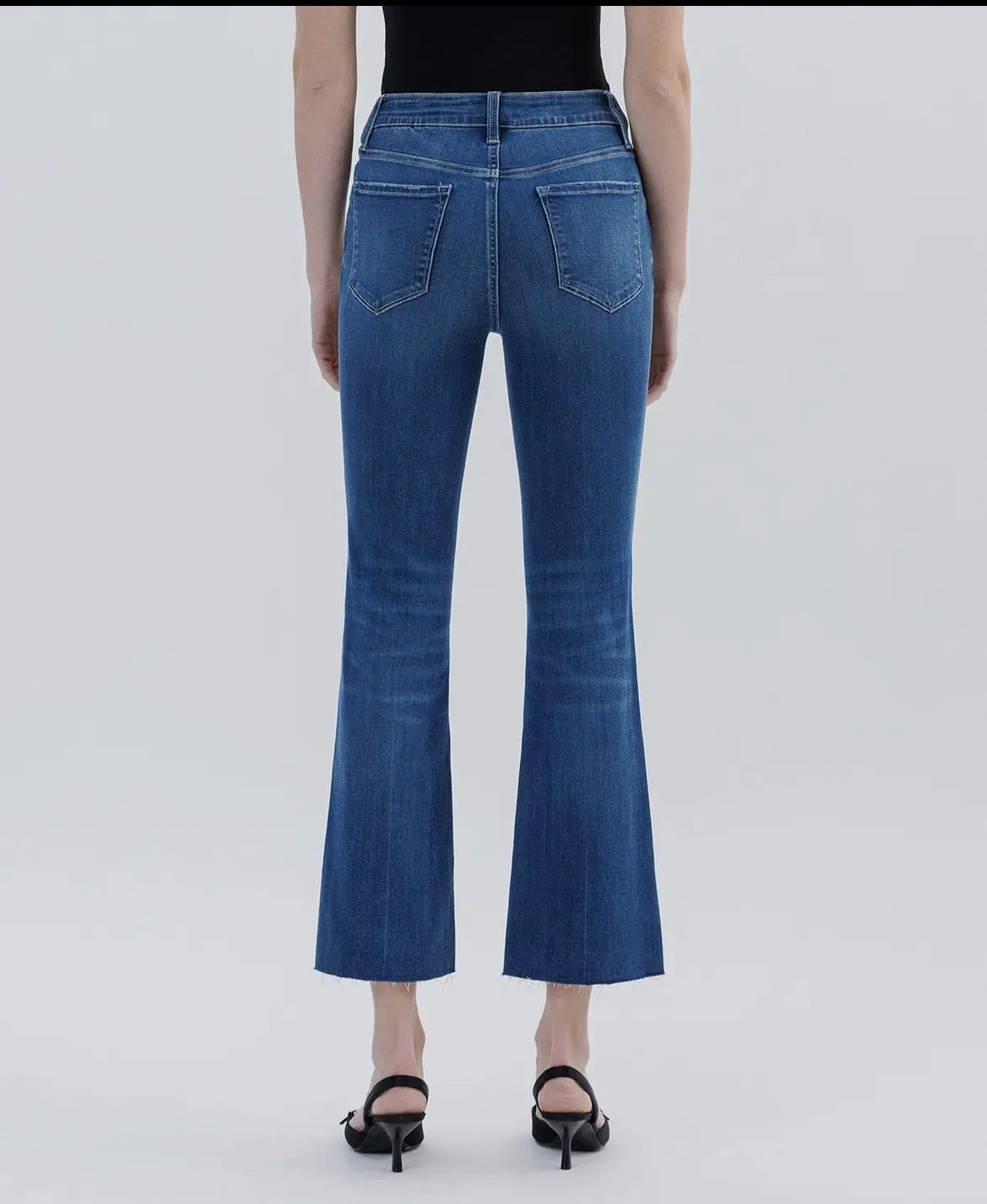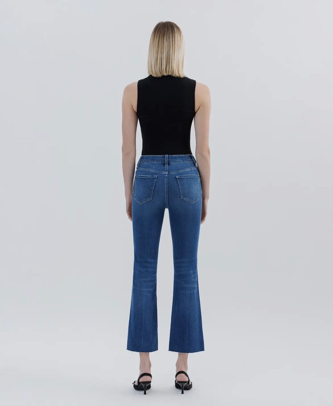 Comfort stretch denim, high rise waist, raw hem, cropped length, kick flare jeans
