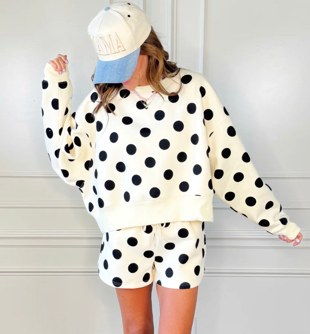 The Polka Dot Lover Sweatshirt features a cream and black polka dot design, combining style with versatility. Its slightly cropped cut enhances body proportions, making it suitable for layering or pairing with high-waisted bottoms. This sweatshirt offers comfort and aesthetic appeal for various casual occasions.