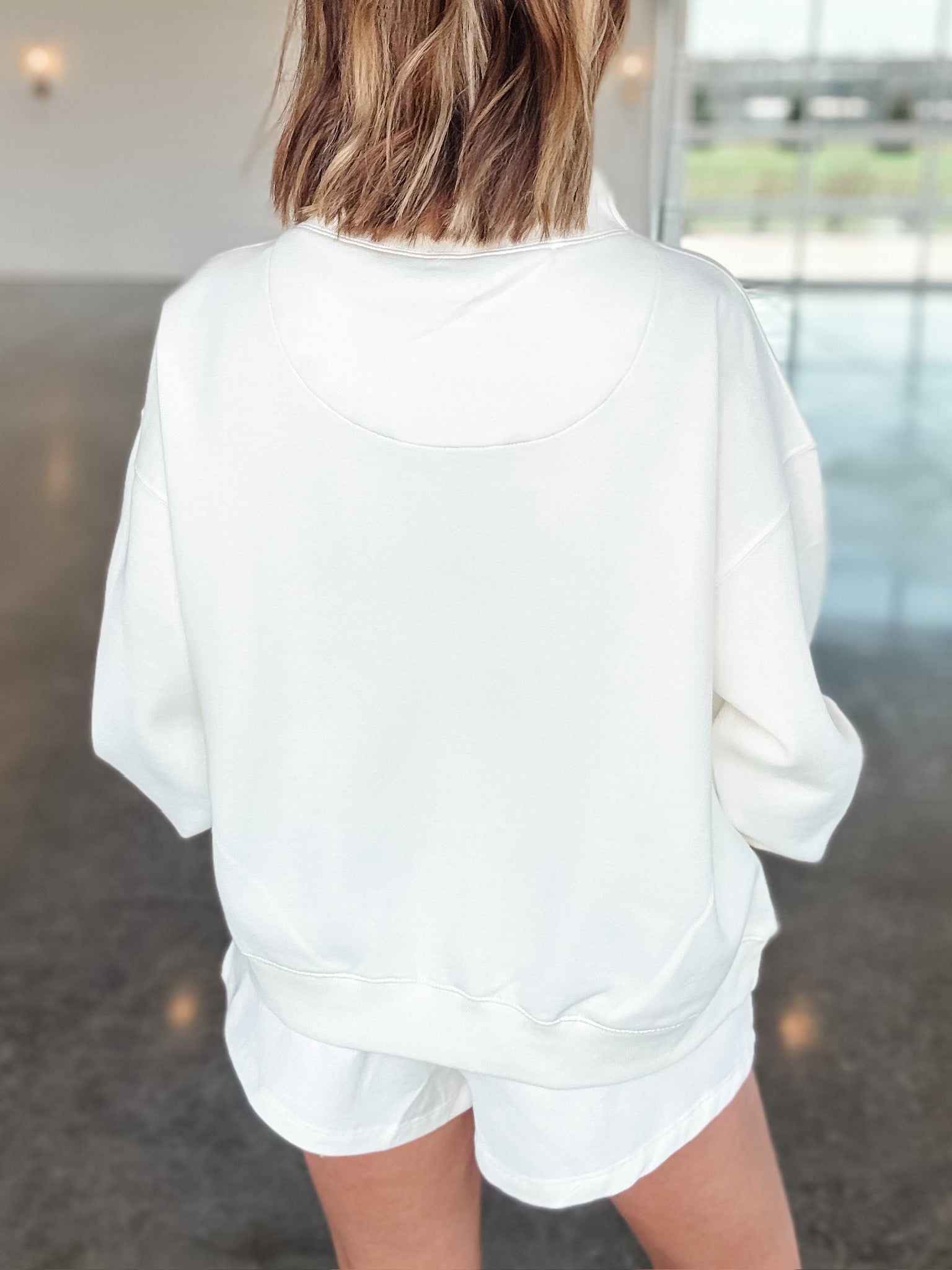 The Royce Ivory Mocked Neck Sweatshirt features a distinctive white color. Its mocked neck design provides additional warmth and comfort, making it ideal for cooler weather. The fabric composition ensures durability and ease of care, enhancing the garment's longevity.